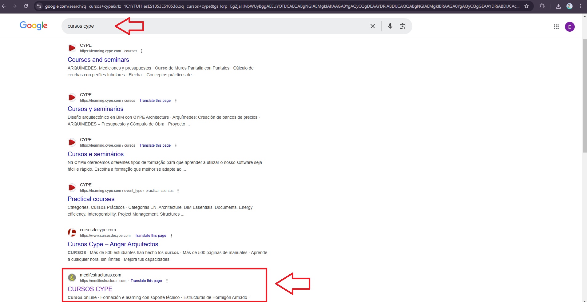 Otro aspecto clave del éxito de Medifestructuras es su posicionamiento en Google. Al buscar "cursos CYPE", el sitio aparece entre los primeros resultados, superando incluso a otras plataformas de capacitación. Este logro no es casualidad; responde a una estrategia bien ejecutada de optimización de contenido, palabras clave relevantes y una estructura web pensada para el SEO.